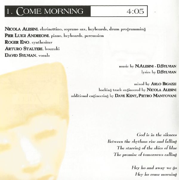 Arturo Stalteri, best known as a pianist and composer, remembers working on the song with affection. ‘I was asked to play bouzouki (the Greek guitar, which I play just for delight)…Nicola is friends with David, so he invited him to write some lyrics and sing on the record. One of the tracks was ‘Come Morning’, and Nicola asked me if I wanted to play bouzouki on it: so we recorded the musical base near to Florence, and we sent it (it was a DAT recording) to Sylvian for him to sing on it. Sylvian did it splendidly. I had played two bouzoukis on the song. When the CD was released, I was a little disappointed, because in the final mix the bouzoukis were very low. But I had my revenge! When David Sylvian released his compilation Everything and Nothing, he completely remixed the tune and he put my bouzoukis VERY LOUD!!!’ (2019)