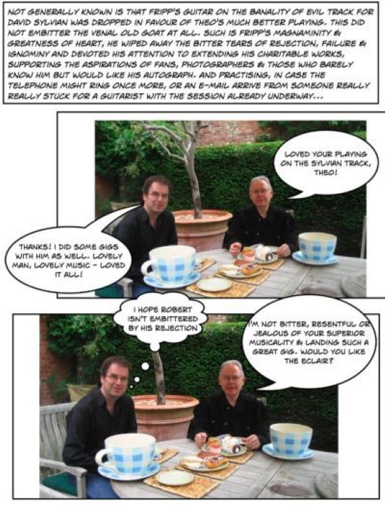 The fact that Robert Fripp was involved with the Snow Borne Sorrow sessions emboldened Theo to approach him about a contribution to a solo project he had underway. ‘It was because we had both been invited to record for this album – and also I was a friend of Steven Wilson and Robert had just been on tour with Steven playing a solo soundscapes support slot for Porcupine Tree – that I thought it would not be out of place for me to get in contact with Robert, as I wanted to propose the idea that he contribute some playing to an album of mine I was working on – Double Talk. It seemed that I was nearer his “orbit”. I wrote to Robert and introduced myself, and he e-mailed back to say that he knew who I was as David Sylvian had chosen my solos over his on the Nine Horses album! That was embarrassing and made me feel very awkward indeed. We did laugh about it later though…’