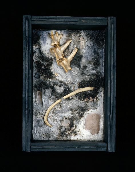 Next, a series of twenty-four boxes hung on invisible wire and containing fragments of significance – some garnered from the remains of ‘Shintin’ in Grizedale Forest. A frame of honeycomb from a beehive, metallic shards decaying into rust, a compass, fragments of bone, a deconstructed violin. Mills: ‘The mixed media boxes that I constructed were all semi-autobiographical assemblages, which dealt with various episodes from my life, along with references to some of my beliefs and preoccupations at the time’.