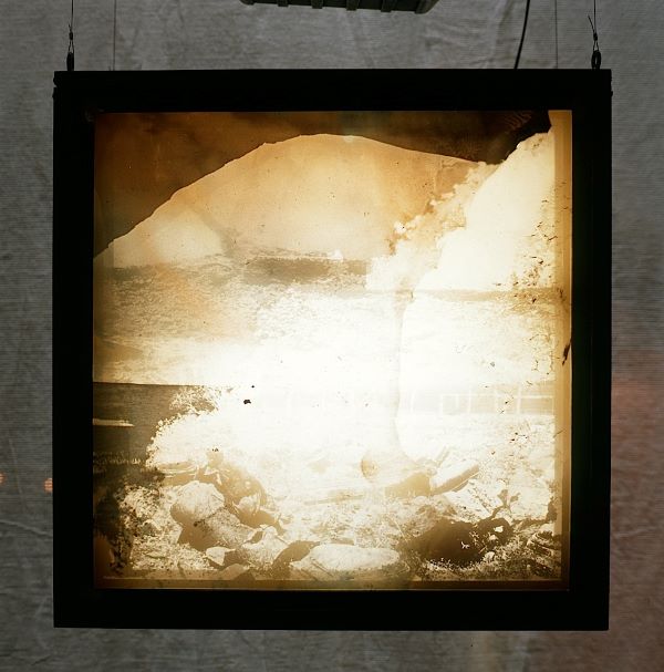 Collage then is an eloquent medium to convey such remembrances and to prompt connections for each one of us. After the mirror, visitors walked through a section of lightboxes which combined treated images like hazy scenes from the past overlaid on one another. Every box was themed: the mind, fire, water, air and earth, and each one was accompanied by a speaker conveying spoken word of significance (see ‘Epiphany’). ‘The lightboxes carried layers of images from old plate negatives transferred onto film,’ Russell told me. ‘The subjects were shots of the Lake District by the Abrahams brothers and of Jerusalem and the Wailing Wall by we don’t know who. Ian had found these years before, the Abrahams negatives in some woods, but I can’t remember where, not in the Lakes, and the Jerusalem photos were, I think, found in a junk shop. Computer-controlled lights within the boxes were constantly changing in luminosity so that one’s focus was always shifting uncertainly between the two locations. Their use and marriage alluded to ideas of the importance of place, its symbolism, its pull (see Heaney, Kiefer and Beuys again).’