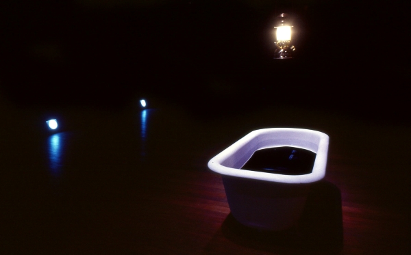 At the rear of the space is a free standing, white enamel bathtub filled with mercury/mirror. Suspended directly above the bathtub (approx. 2 or 3 feet) is an oil lamp giving off a blue/white light, reflected in the surface of the mercury/mirror.