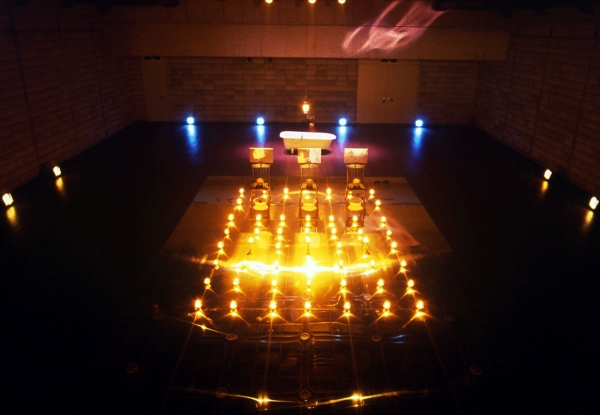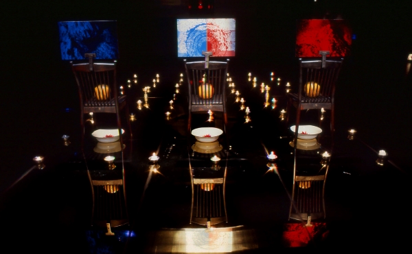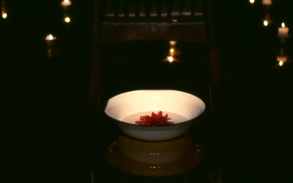 Beneath each chair sit three identical white enamel bowls half filled with water. At the centre of each bowl floats a red lotus flower.