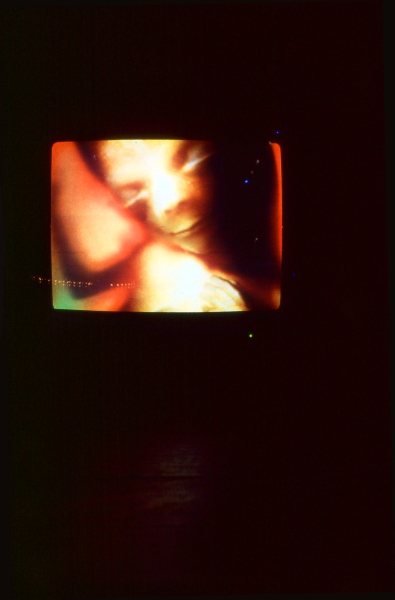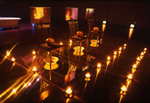 Along the rear wall placed at intervals upon the floor are 4 TV monitors broadcasting the image of a full moon. This area is bathed in a gentle blue light in marked contrast to the rest of the space glowing in a red/gold.