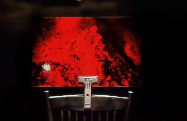 The re-occurring images in these prints, abstract in nature, are the Himalayan Mountains. They are dimly lit from above casting a shadowy light onto the skulls below. Surrounding the chairs in neat, straight lines are 51 butter lamps placed upon the copper floor tiles. The butter lamps give off a red/gold light, reflected in the tiles.