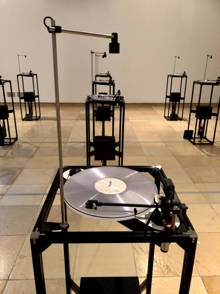 Sakamoto’s involvement in Dumb Type’s concurrent exhibition in Munich was to provide field recordings for a reinvention of the group’s work Playback. These were recorded by Ryuichi’s friends from around the world whom he asked to capture ‘the environmental sounds of their living place.’ They were then cut to vinyl to be played on sixteen individual record players set out in the installation space.