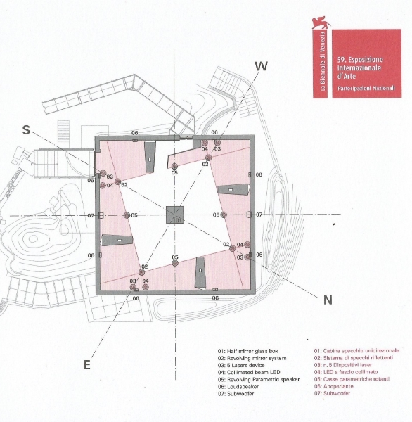 Visitors to Venice enjoyed a much more complex experience of the installation sound than can be represented in the video which is restricted by the ‘flat’ stereo format. Satoshi Hama, one of the new programmers in Dumb Type, explains more: ‘The first place everyone goes when they enter is the hole in the floor. Over to the hole. They’re finding it visually dominating. In short, they gather in the centre of the room, surrounded by the lasers and so on in the four corners around it…Of course, that spot is in the centre of the eight speakers, so it’s actually also the easiest place to express things through sound.