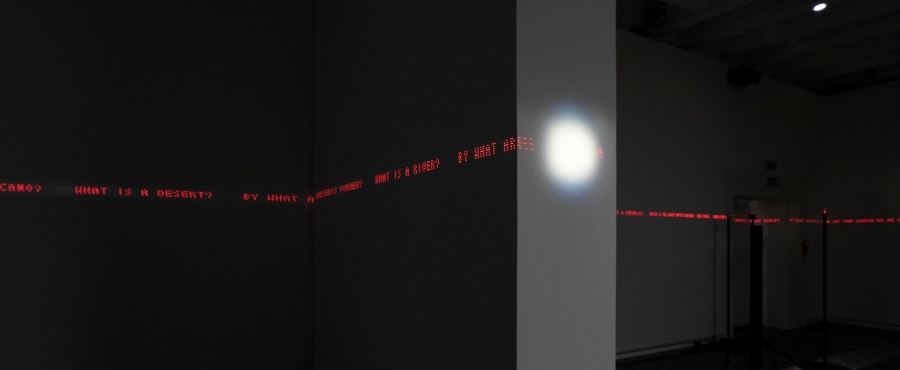 The lasers are used in an innovative way to form a ‘horizon’ that encircles the room and at times the beams coalesce to form in letters the questions from James Monteith’s textbook. This is how the catalogue described the experience: ‘Mirrors on four stands positioned to the north, south, east, and west of the centre of the exhibition room rotate at high speed, reflecting lasers trained on them to project text onto the surrounding walls…posing simple yet universal questions. The sounds of voices reading the texts are emitted from rotating parametric speakers, becoming highly directional beams of sound that travel around the room, suddenly and unexpectedly reaching visitors’ ears.’