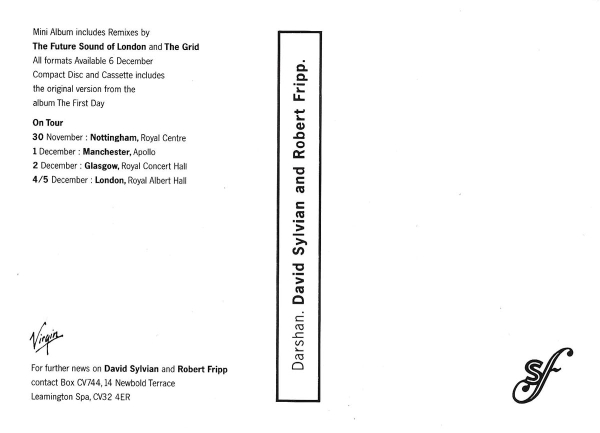 It was at The Royal Albert Hall in London in December 1993 that I became aware that there was to be a mini-album release by Sylvian/Fripp, Darshan. This would be the only occasion that I would see David Sylvian and Robert Fripp share the stage, their earlier touring incarnation in a trio with Trey Gunn never having visited the UK. As we took our place in the stalls, full of anticipation for the first of two London shows on The Road to Graceland tour, set on each seat was a postcard announcing the new release – which would be in the shops the following week!