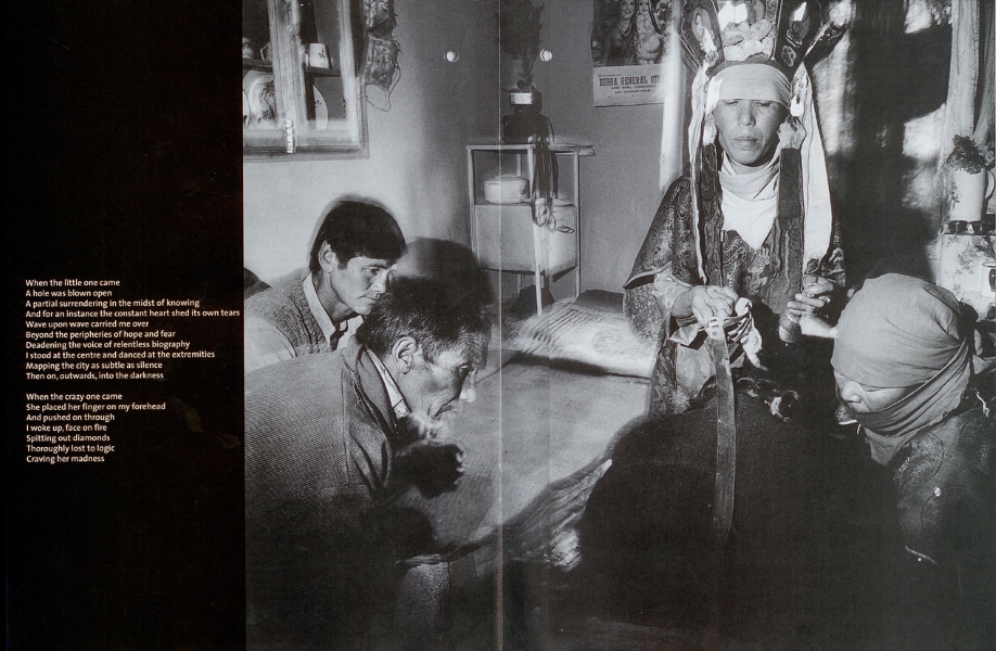 These mysterious words would later feature on Everything and Nothing with different musical backing as ‘Thoroughly Lost to Logic’. Before then, they were published in the February 1999 edition of Janus, a supplement magazine distributed alongside the Belgian newspaper De Standaard. For the article, A Shaman’s Song, Sylvian selected three of his own poems to accompany photographs by Carl De Keyzer from a series entitled, The Seven Oracles of Ladakh. These pictures follow ‘those specially gifted and respected men and women, “oracles”, who do healings, exorcisms and predictions under trance in the [North Indian] villages of Thiksey, Sabu, Choglamsar, Leh and Stok. These Buddhist rituals take place every morning in the oracles’ houses and are attended every day by about twenty people…Rituals last several hours.’
