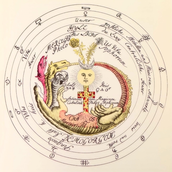 Diagram from Codex Rosae Crucis, described there as follows: ‘The Dragon of Chaos. In the midst of the plate is a three-headed dragon whose heads by one interpretation are ignorance, superstition and fear, and by another interpretation wrong thought, wrong feeling and wrong action. The dragon with its tail in its mouth represents eternity or ageless chaos, the slime of space from whose dark womb Cosmos or order is born. The cross, the solar face, and the lunar crescent together make the symbol of Mercury, the proper hermetic figure for the adept or perfected man. From the lunar crescent rise the rose of Sharon and the lily of the valley. By the rose is here meant the red tincture, the elixir of life. By the lily, the white tincture or transmuter of metals. The whole figure is a Rosicrucian rebus.’