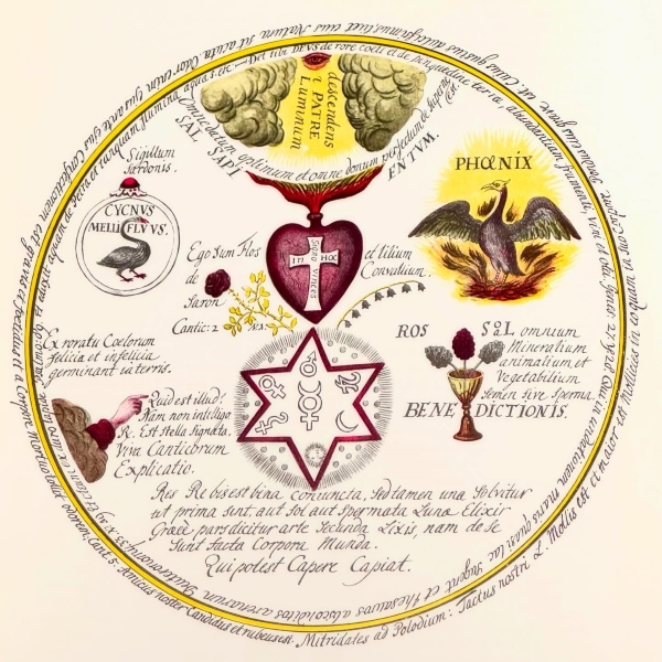 Diagram from Codex Rosae Crucis, described there as follows: ‘The central part of the figure represents the three spheres, spirit, soul, body. In the spiritual world is the eye of God hidden by clouds. In the world of the soul is a heart containing a cross symbolising the purification of the human emotions. In the material world beneath are emblems of the elements and plants. From the material worlds rises the rose of Sharon and the lily of the valley, representing the emotional and intellectual approaches to truth. Surrounding the central design are several alchemical figures.’