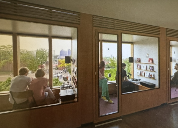 ‘At GULLIVER, Collins installed a phone booth with a free line which anyone could use for unlimited local and international calls, on the agreement that the conversations would be recorded and anonymised. Selected from more than a thousand calls made over a four-week period, the material was posted to a group of musicians, serving as the starting point for original new songs. These were pressed as 7″ vinyl records and presented in an exhibition at Museum Ludwig in specially designed listening booths, each equipped with a turntable and high quality sound system, installed so as to overlook a busy public square and the railway bridge.
