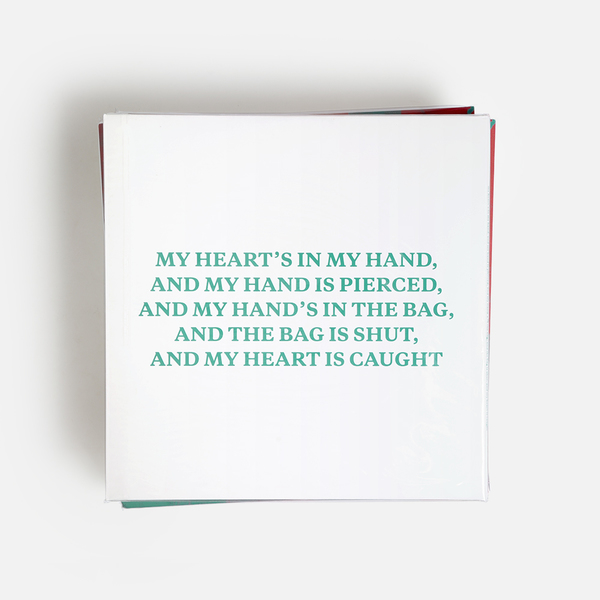 ‘After the installation in Cologne, the work, entitled my heart’s in my hand, and my hand is pierced, and my hand’s in the bag, and the bag is shut, and my heart is caught, was presented in adapted configurations in New York and Berlin.