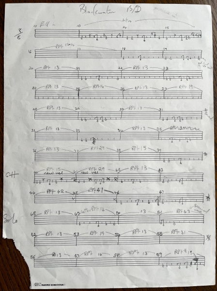 Mick recalled the stay at ‘Wool Hall in Bath for two weeks, where Steve began working with a kettle drum for ‘Blackwater’ on the Monday. Come Thursday, we were still listening to the one solitary kettle drum which just couldn’t be made to sound perfect enough and, thankfully, we moved on to something else on the Friday, until the following Thursday and another four days of the kettle drum that drove Steve to the edge of insanity. Try and imagine 7 days filled with listening to one drum continually from morning till night and perhaps you’ll understand how torturous improvisation can be!’ (2009)