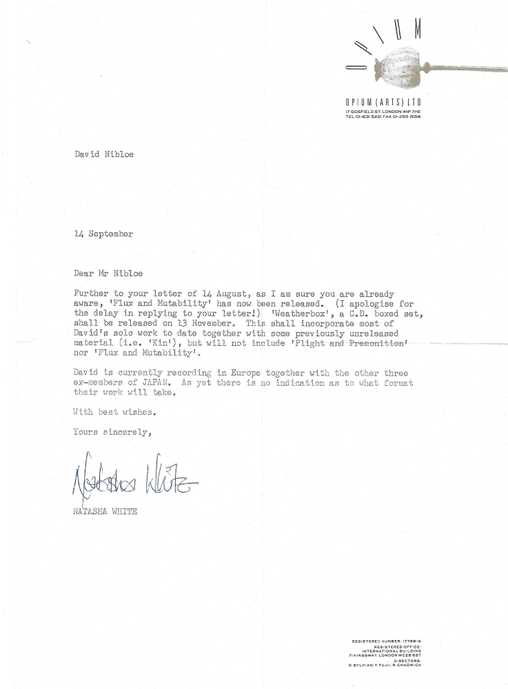 During this period I was in the habit of writing occasional letters to Sylvian’s management company, Opium (Arts) Ltd, at their London offices of 17 Gosfield Street, eager for news of present and future projects. It would sometimes take a considerable time for a response to be received, but there was always excitement in receiving a type-written update on smart Opium letterhead (‘Directors: D. Sylvian, Y. Fujii, R. Chadwick’) from the ever-patient Natasha White. My letter of August ’89 was rewarded with an update on the release of Flux and Mutability and the forthcoming Weatherbox 5-cd collection, followed by confirmation that ‘David is currently recording in Europe together with the other three ex-members of Japan. As yet there is no indication as to what format their work will take.’