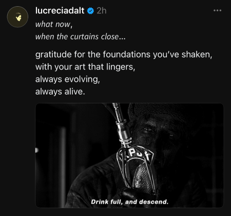 ‘In case my last post wasn’t in any way clear due to message vs image,’ she explained, ‘the image belongs to part 8 (‘Gotta Light?’) of Twin Peaks: The Return, which to me is one of the most inspiring, mind-bending, unexpected pieces of art made for tv.’