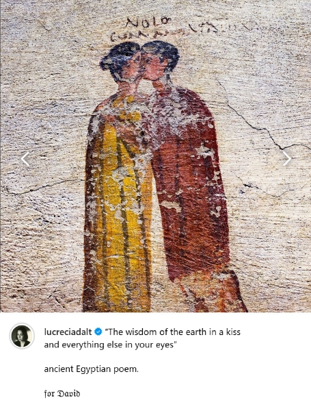The opening line is based around an ancient Egyptian poem that Lucrecia had shared, dedicated to David, on instagram: ‘The wisdom of the Earth in a kiss and everything else in your eyes.’ ‘I started to think, “OK, how can I give that a little twist from my point of view?”