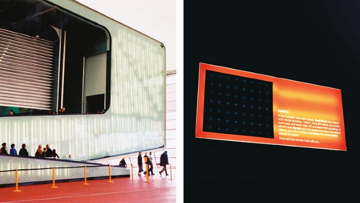 The visitor sign within the Dome invited people to ‘listen and sense the sounds travel around the space. Move and the sounds move with you.’ Ryoji’s website explains: ‘Matrix is a series of sound installations employing pure sine waves and white noises as a sculptural material…As visitors pass through the sound field, subtle oscillation patterns occur around their ears, caused by their own movements interfering with the sounds. It is a very personal experience, and only through the visitors’ physical engagement in the sound space can the real character of the work be perceived.’